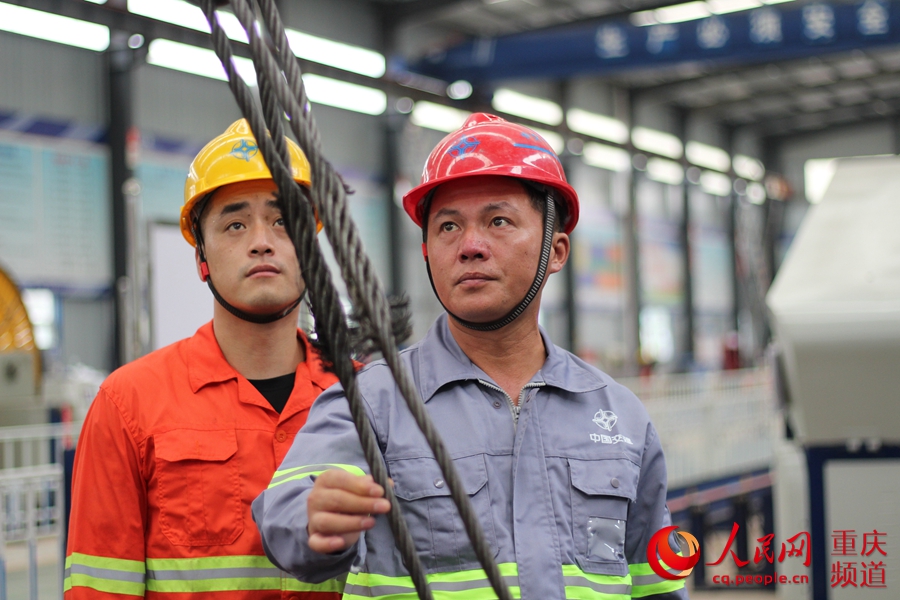 拆裝橫向支撐設備前,李廣輝與工友一同檢查卷揚機的安全性能。中交一公局 供圖